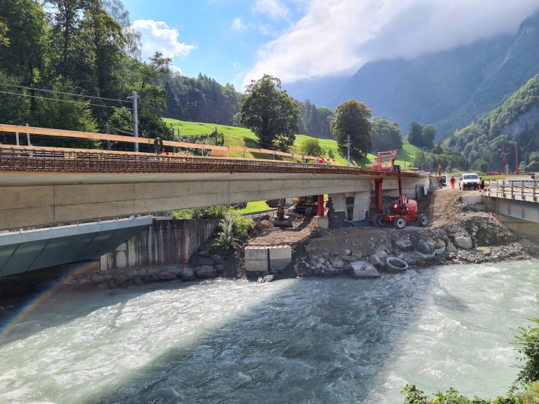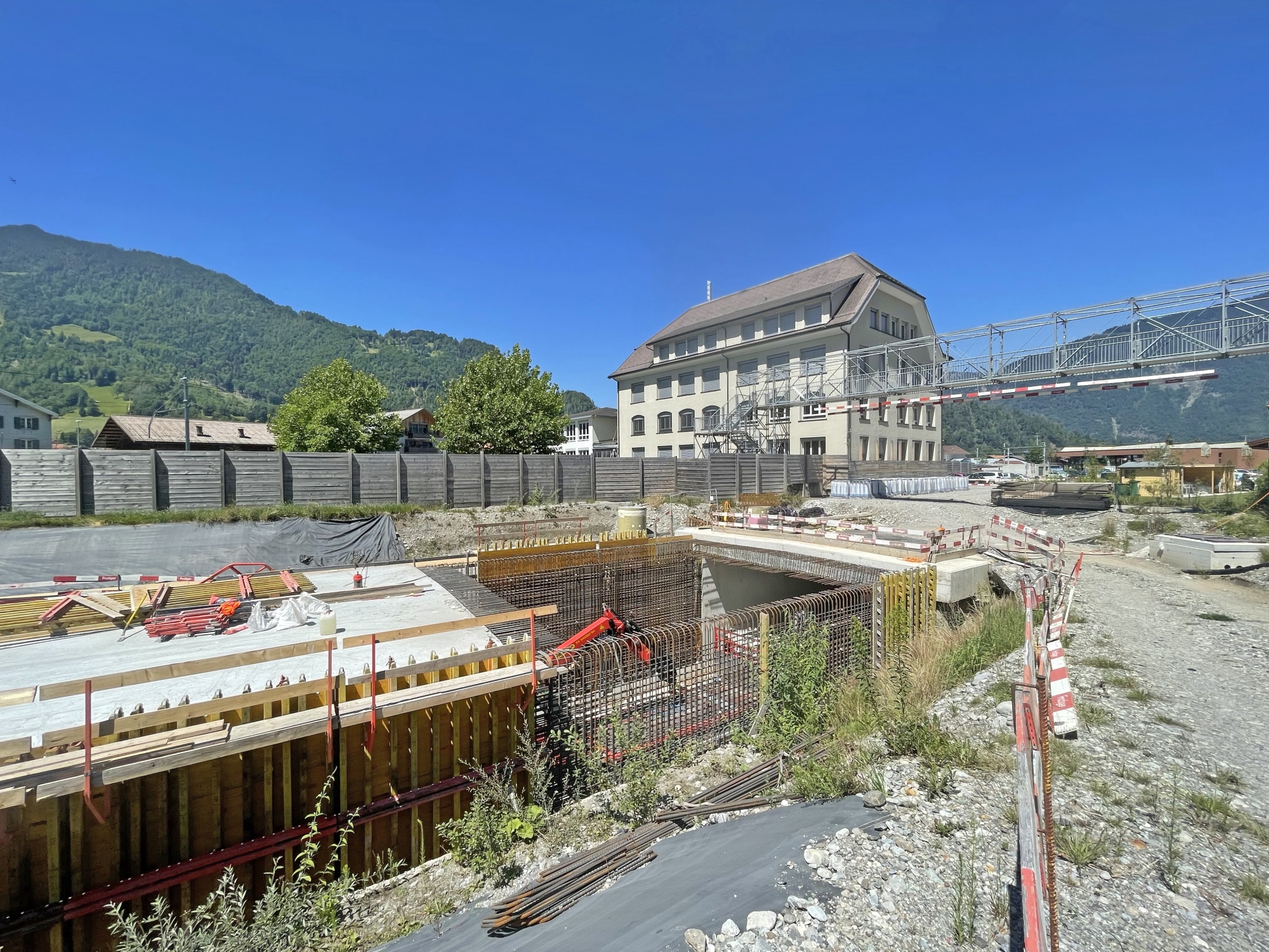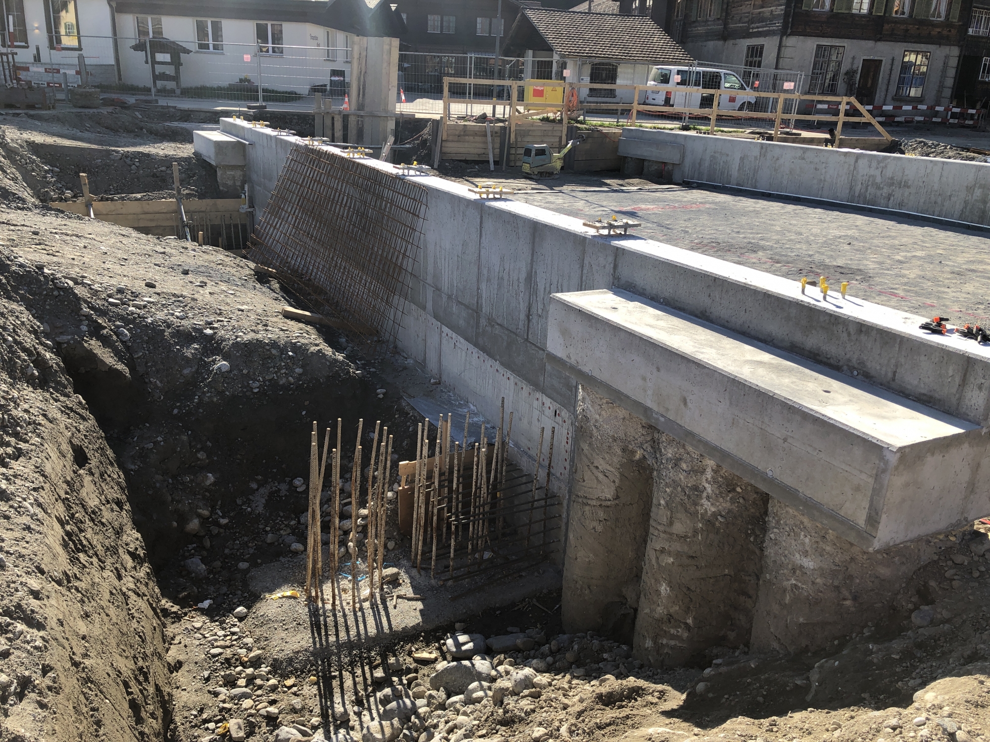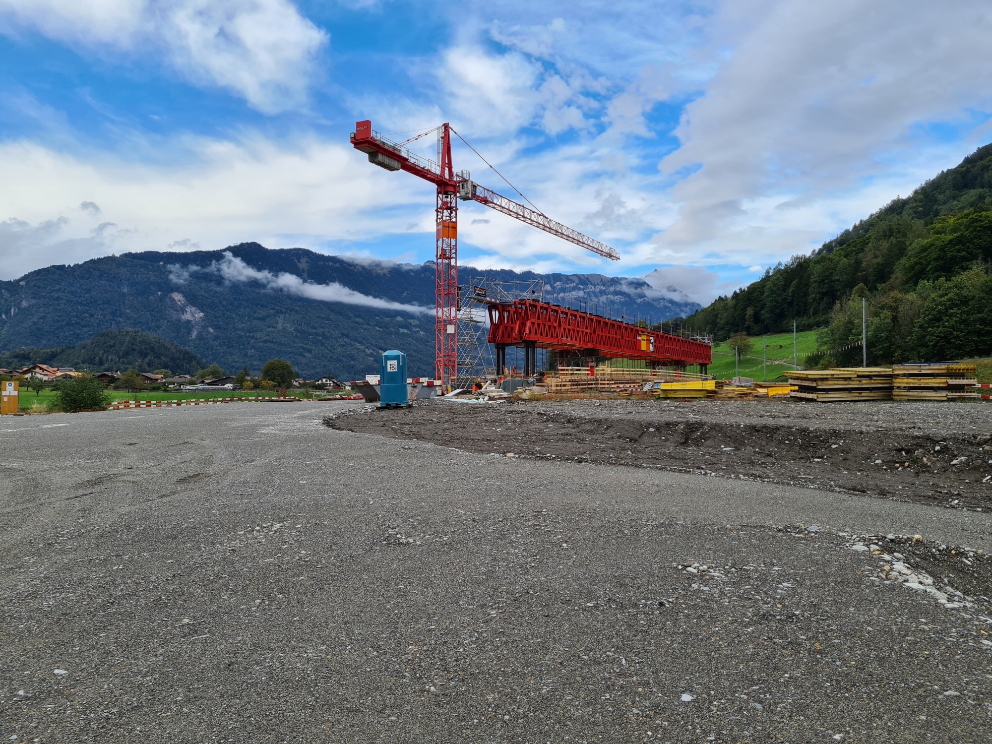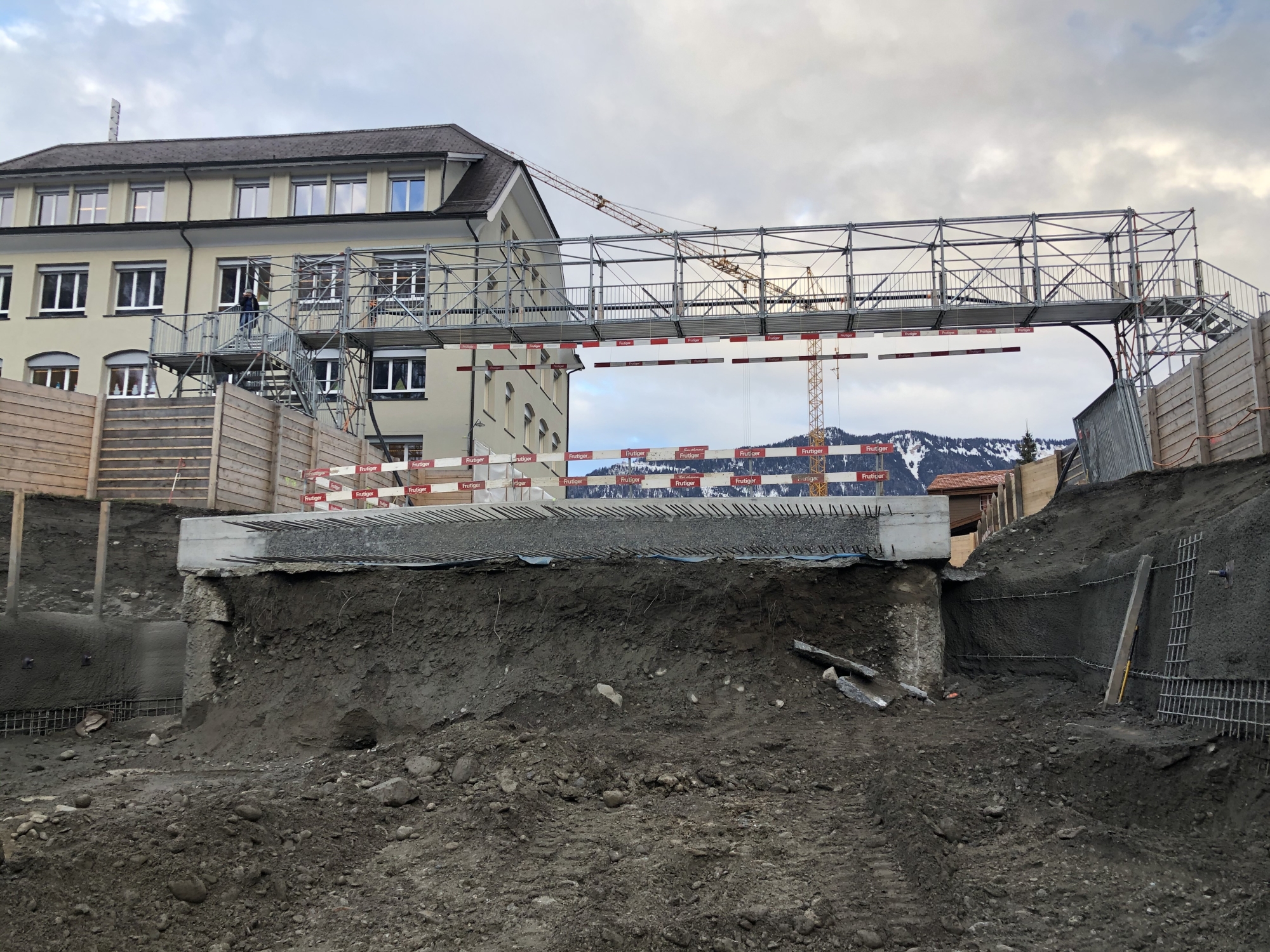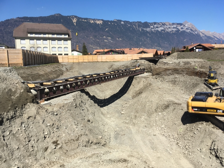 Bei den beiden Brücken über die Lütschine sind die Arbeiten an den Fundamenten und Widerlager gestartet. Erste Vorarbeiten für die Montage der obenliegenden Lehrgerüst der Brücke Nord wurden getätigt. Die Montage erfolgt im April.