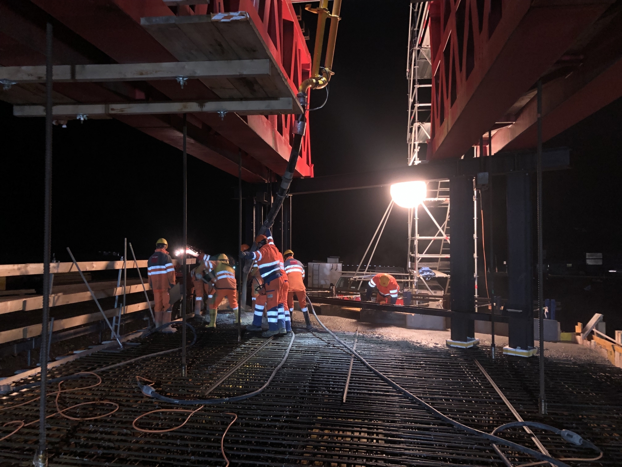 Die Brücke Süd wurde am 11. November 2021 in einem Tag betoniert. Nach dem Aushärten des Betons und dem Vorspannen konnte bereits mit dem Ausschalen begonnen werden. Das auffällige rote obenliegende Lehrgerüst wird Anfang 2022 demontiert.