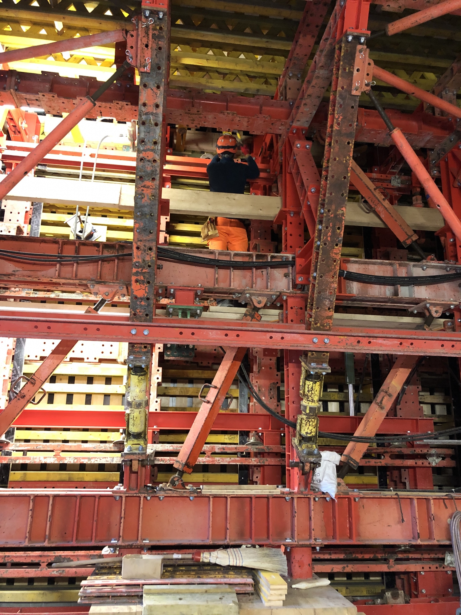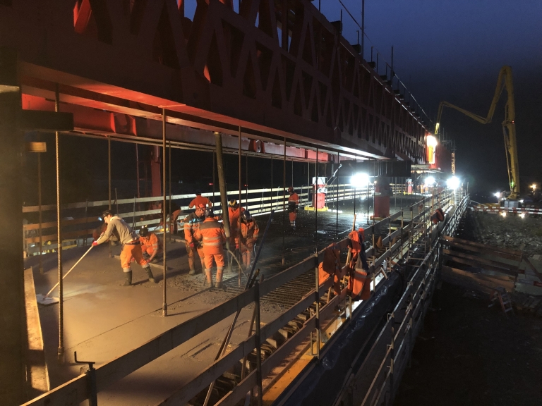 Im April wurde das Lehrgerüst der Brücke Nord montiert. Das rote Stahlgerippe ist von weit her sichtbar. Danach wurde die aufwändige Schalung, Bewehrung und Vorspannung verlegt, so dass termingerecht am 1. Juli die erste der beiden Brücken im Projekt betoniert werden konnte.