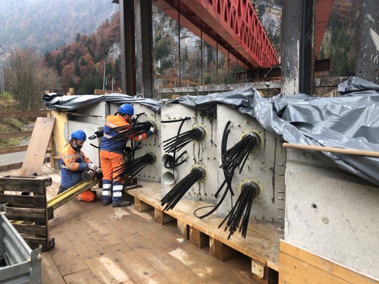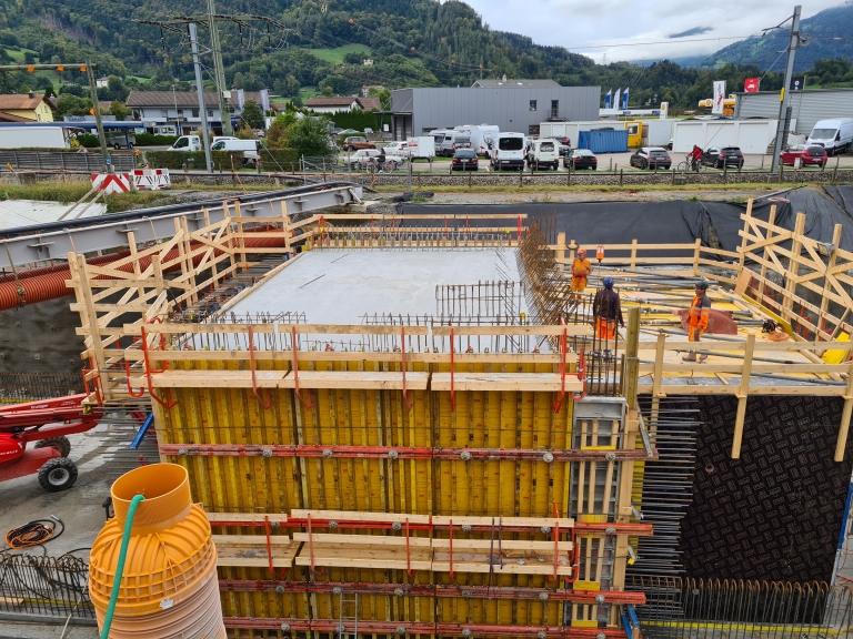 Bei der Brücke Nord werden in der nächsten Wochen die Konsolenköpfe betoniert und bei der Brücke Süd wird aktuell die Schalung erstellt. Das Betonieren der Brücke Süd soll noch in diesem Herbst erfolgen.