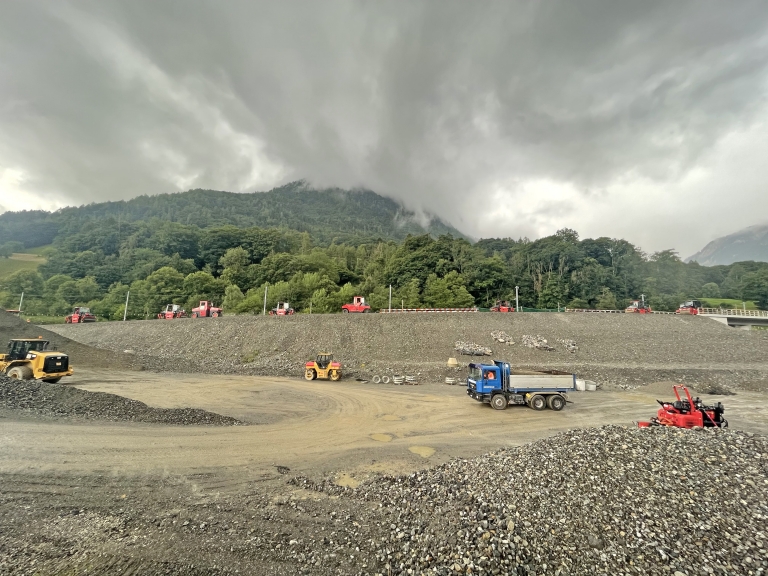 Aus dem vorhandenen Aushubmaterial des Tunnels wurden die Strassendämme entlang der Bahnstrecke geschüttet. Das überschüssige Aushubmaterial wird direkt auf der Baustelle zu hochwertigen Kiesgemischen aufbereitet, welche als Fundationsschicht für den Strassenabu im 2022 genutzt werden können.