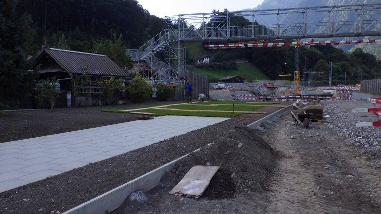 Im Bereich der grossen Geländearbeiten in der Flisou auf der Ostseite der Lütschine wurde der trockene Sommer für die Rekultivierung des Landwirtschaftslands genutzt. Schon im Herbst verwandelte sich die ehemals braune Fläche in eine grüne Grasfläche.
