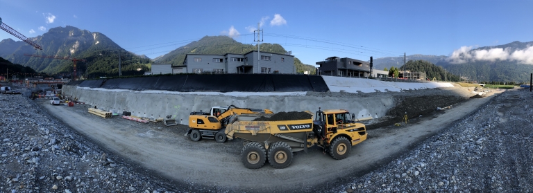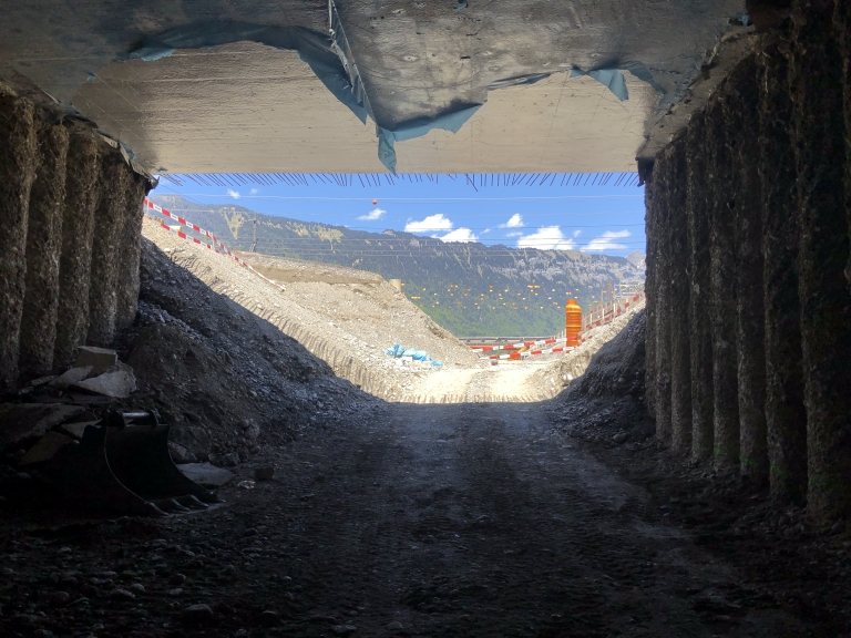 Der 28. Mai war auf der Baustelle ein grosser Tag: Der Durchstich des Deckelbaus im Tagbautunnel ist erfolgt. In den letzten Monaten gruben sich die Bauarbeiter unter dem Dorfzentrum durch und kamen Ende Mai auf der Nordseite des bewohnten Gebiets wieder ans Tageslicht. Der Aushub aus dem Tunnel wurde direkt in die grossen Strassendämme weiter südlich eingebaut. Auf dem Tunneldeckel starteten im Dorfbereich bereits wie Arbeiten für die Wiederherstellung der Strassen und Plätze.