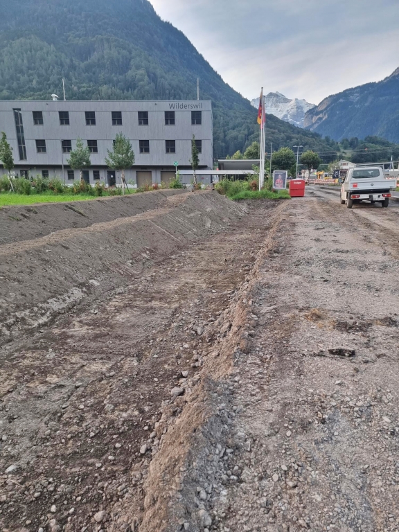 Im Auftrag der Gemeinde Wilderswil wurde eine neue Abwasserleitung ab Sportplatz zum Direktanschluss erstellt, welche bei starkem Wasseranfall die Ableitung Richtung ARA sicherstellt.