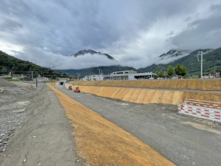 Auf einer Länge von rund einem Kilometer wird die Umfahrungsstrasse auf einem Damm entlang der Bahnlinie mit umfangreichem Trasseebau mit verschiedenen Stützmauern erstellt. Im Rahmen des Projekts werden geeignete Aushubmaterialien direkt in die Strassendämme eingebaut oder zu hochwertigen Baustoffen aufbereitet und vor Ort verbaut.