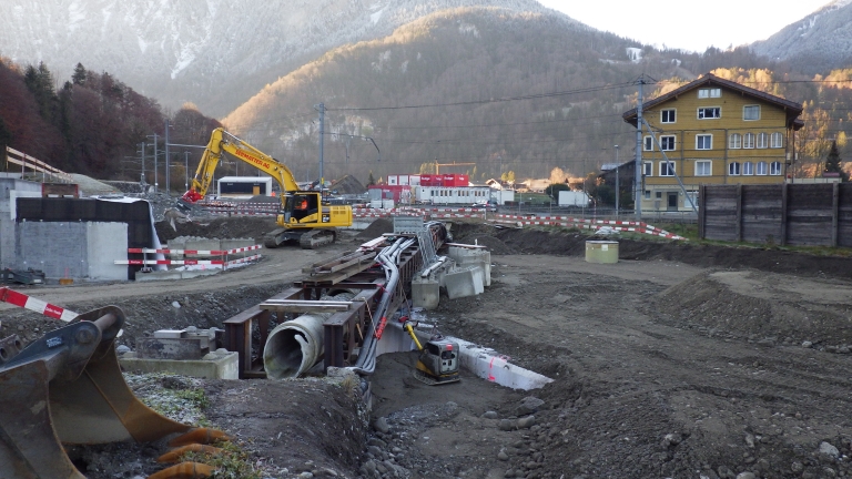 Der Deckelbau im Dorfbereich schreitet zügig voran. Im Wochentakt wird ein Deckelelement mit einer Länge von 12.5 Metern betoniert. Neben dem Schulhaus wurde im Februar mit dem Untergraben des Deckels begonnen. Das Material wird direkt zu den Strassendamm-Einbaustellen weiter südlich in der Oberey geführt und dort eingebaut.