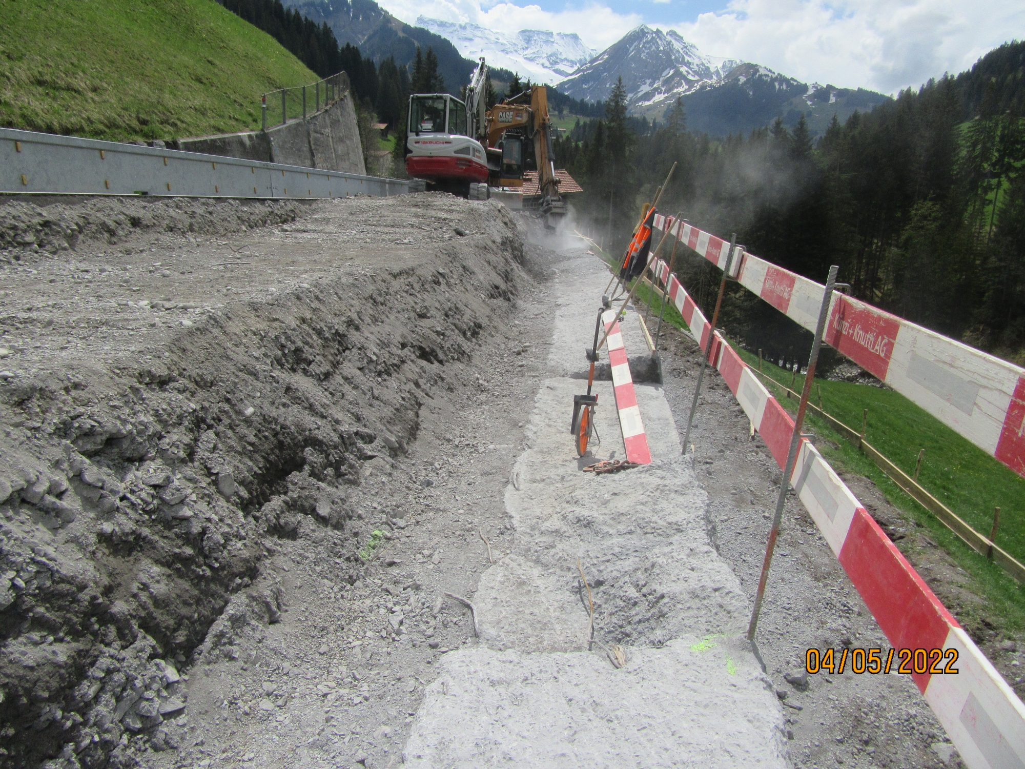 Gestartet wurde mit dem Teilabbruch im Kopfbereich der talseitigen Stützkonstruktion für dessen Ersatz sowie dem Einbau einer Mikropfahlfundation. Auf einer Abschnittslänge von ca. 200m sind weiter folgende Arbeiten vorgesehen: